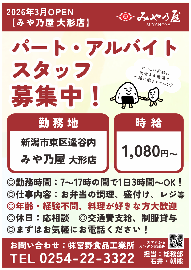 いつもみや乃屋をご利用いただき誠にありがとうございます。みや乃屋は、2026年3月に新潟市東区にみや乃屋《大形店》をオープンいたしました。新店舗オープンに伴い、パート・アルバイトスタッフを募集中です!!