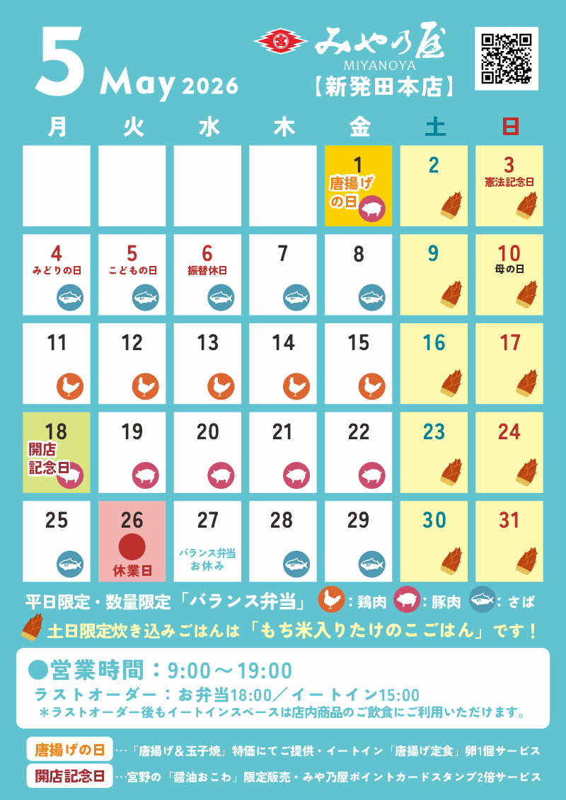 《新発田本店》5月の営業カレンダー 2026.4.222026.04.22いつもみや乃屋をご利用いただき誠にありがとうございます。《新発田本店》の5月の営業カレンダーです。5月の土日限定炊き込みごはんは【もち米入りたけのこごはん】です!平日限定・数量限定【バランス弁当】の販売スケジュールもこちらでご確認いただけます。5/26(火)は清掃点検日のため休業日とさせていただきます。