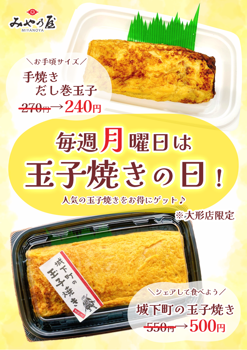 《大形店限定》【玉子焼きの日】のお知らせ 2026.4.28 2026.04.28いつもみや乃屋をご利用いただき誠にありがとうございます。5月より、みや乃屋《大形店》では毎週月曜日を【玉子焼きの日】とし人気の玉子焼き商品を特別価格にてご提供させていただきます!◎お手軽サイズの【手焼きだし巻き玉子】通常価格270円のところ→240円(税込)◎シェアして食べよう!【城下町の玉子焼き】通常価格550円のところ→500円(税込)毎週月曜日は人気の玉子焼きをお得にゲットしよう♪スタッフ一同、ご来店を心よりお待ちしております。