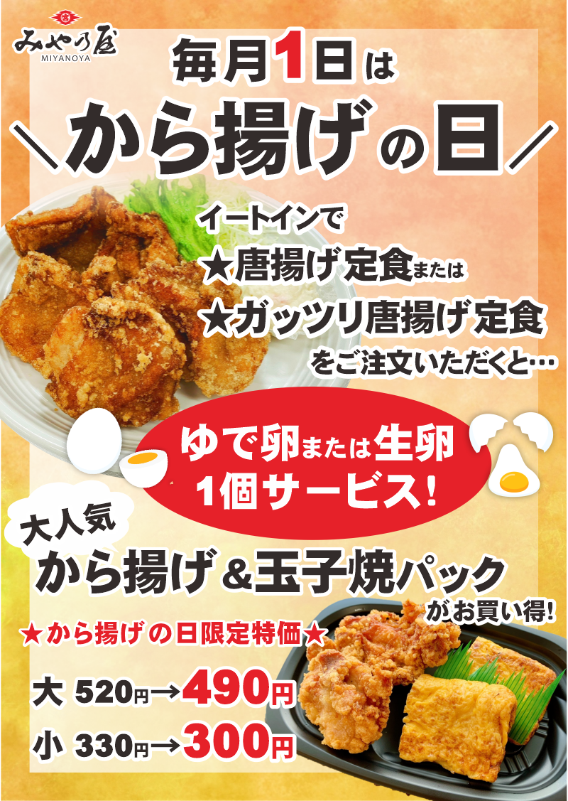 唐揚げの日2026.03.232022.02.18毎月1日は\唐揚げの日/ ※新発田本店のみイートイン「唐揚げ定食」卵サービス!! イートインで「味自慢とり唐揚げ定食」または「ガッツリとり唐揚げ定食」をご注文いただいた方に卵1個サービスさせていただきます!!ゆで卵または生卵からお選びください。唐揚げ定食に卵1個サービス!!大人気「唐揚げ&玉子焼き」特価にてご提供!! 人気のふたつの味が一度に楽しめるデリカの人気商品「唐揚げ&玉子焼き」を唐揚げの日限定特価にてご提供いたします!!人気の「唐揚げ&玉子焼き」がお買得!